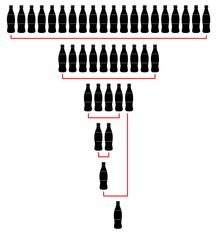 문제를 풀던 상빈이는 콜라 문제의 완벽한 해답을 찾았습니다. 상빈이가 푼 방법은 아래 그림과 같습니다. 우선 콜라 빈 병 20병을 가져가서 10병을 받습니다. 받은 10병을 모두 마신 뒤, 가져가서 5병을 받습니다. 5병 중 4병을 모두 마신 뒤 가져가서 2병을 받고, 또 2병을 모두 마신 뒤 가져가서 1병을 받습니다. 받은 1병과 5병을 받았을 때 남은 1병을 모두 마신 뒤 가져가면 1병을 또 받을 수 있습니다. 이 경우 상빈이는 총 10 + 5 + 2 + 1 + 1 = 19병의 콜라를 받을 수 있습니다.