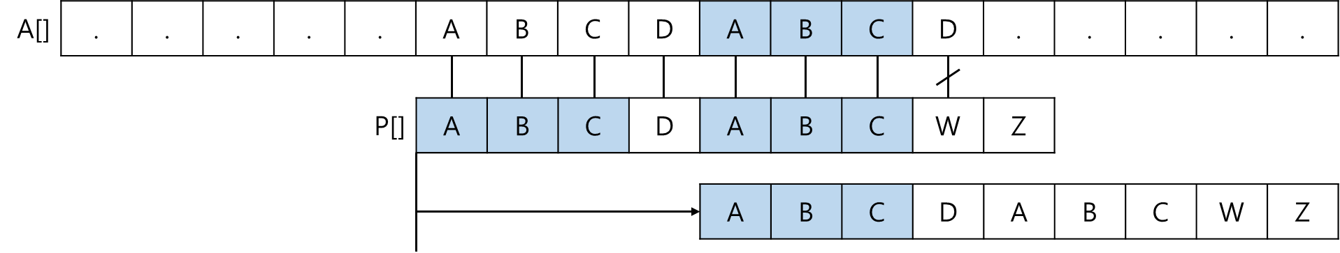 - 텍스트의 문자 'D' 직전의 문자열 'ABC'는 패턴의 맨 앞부분 세 문자와 일치하므로 이 정보를 이용하면 텍스트의 문자 'D'와 패턴의 4번째 문자를 비교하면 됨.