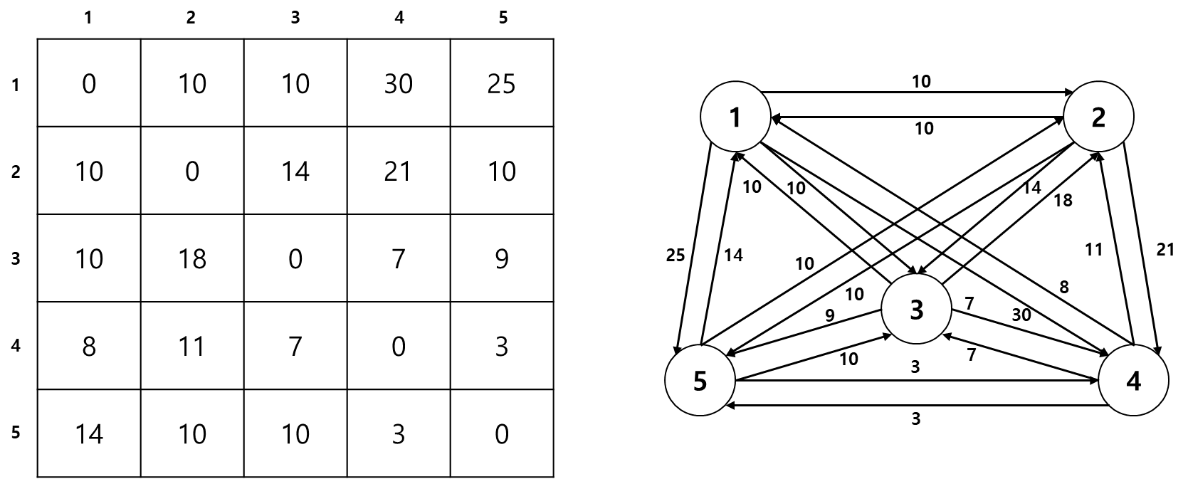 - 즉, 간선이 하나 있으면 이것은 양방향으로 동일한 길이를 가짐. 이것을 대칭형 TSP라 함. 이 성질이 만족되지 않는 비대칭 TSP도 있음.