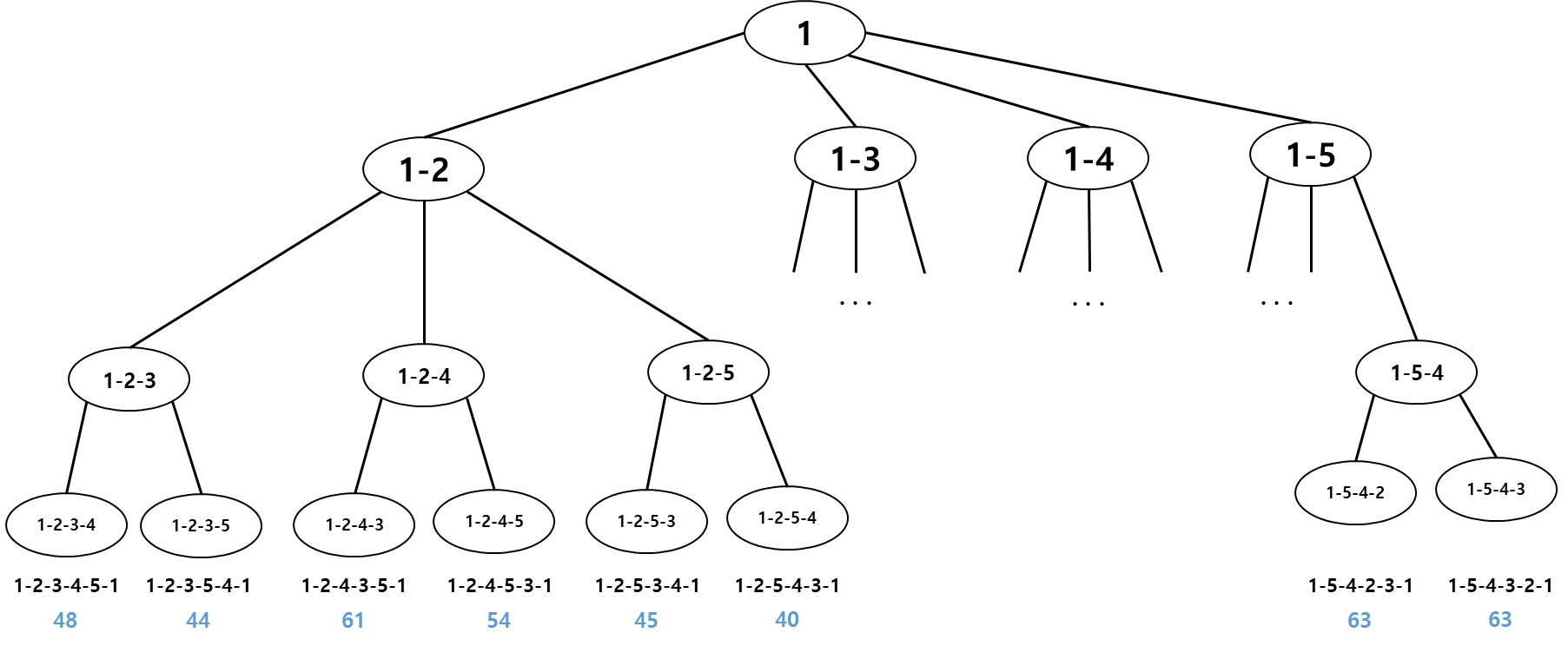 - TSP 예를 대상으로 모든 경우의 수를 탐색하는 알고리즘.