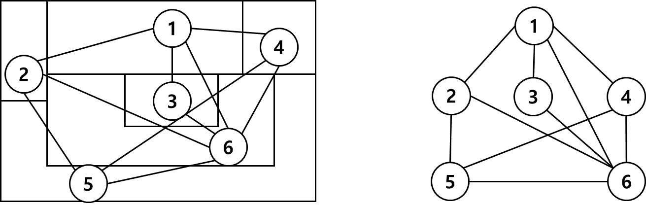- 아래의 그림은 각 구역을 정점 하나로 표현하고 인접한 구역끼리 간선으로 연결하고, 보기 편하도록 정리함.