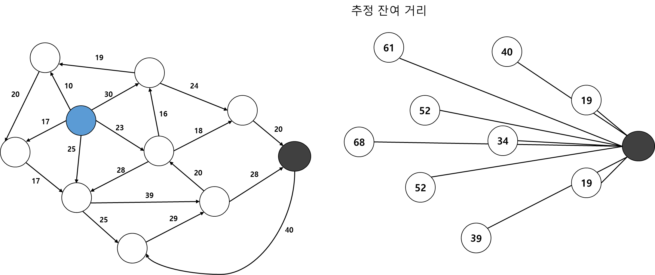 - 각 정점에서 잔여 거리를 정확하게 미리 알 수 있는 경우는 거의 없지만, 추정할 수 있는 경우는 많음. 예를 들어, 지도에서 두 지점간의 최단 경로는 좌표상의 직선 거리를 추정치로 사용할 수 있음.