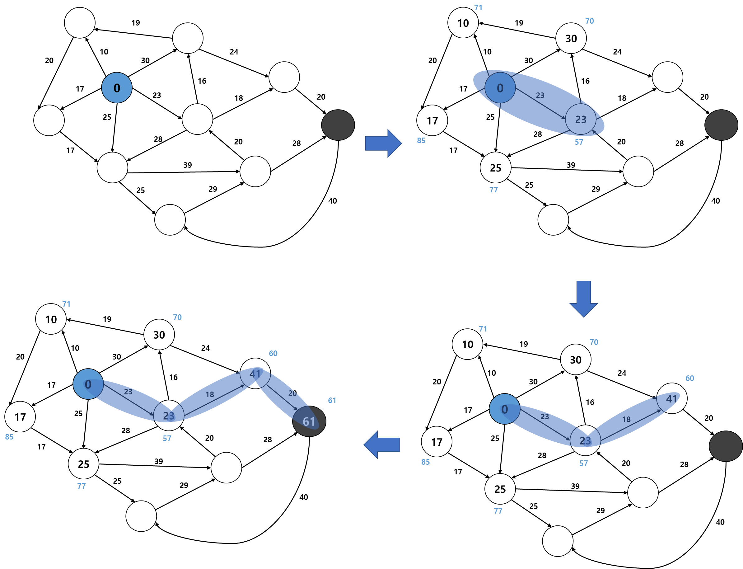 - 정점을 나타내는 동그라미 안에 있는 수치는 지금까지 계산해좋은 각 정점에 이르는 최단 거리( g(x) ).