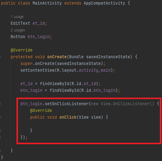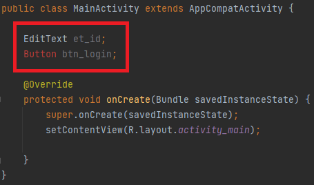버튼에 기능을 추가해보겠습니다. MainActivity.java 파일로 이동해서 변수를 선언해줍니다. 헷갈리는 것을 방지하기 위해 xml 파일에서 id로 지정한 값을 적었습니다. import가 정상적으로 되지 않으면 빨간색으로 뜨게되는데, 이때 커서를 대고 'Alt' + 'Enter'를 눌러 class를 import 해주면 됩니다.