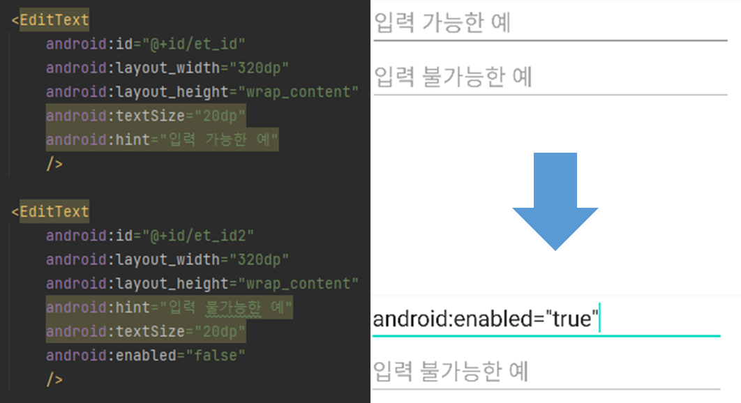 'EditText'에 사용자가 입력 및 수정 여부를 선택할 수 있습니다. default 속성값은 true이며, false로 변경 시 사용자는 입력과 수정을 할 수 없게 됩니다.