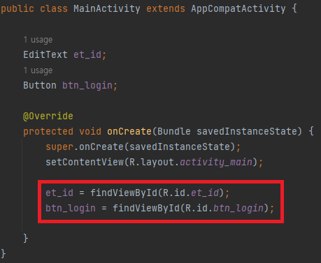 findViewById() 메소드를 이용하여 xml 파일에서 레이아웃에 설정된 뷰들을 가져옵니다. 이것을 사용하면 동적으로 화면을 변경시킬 수 있게 됩니다.