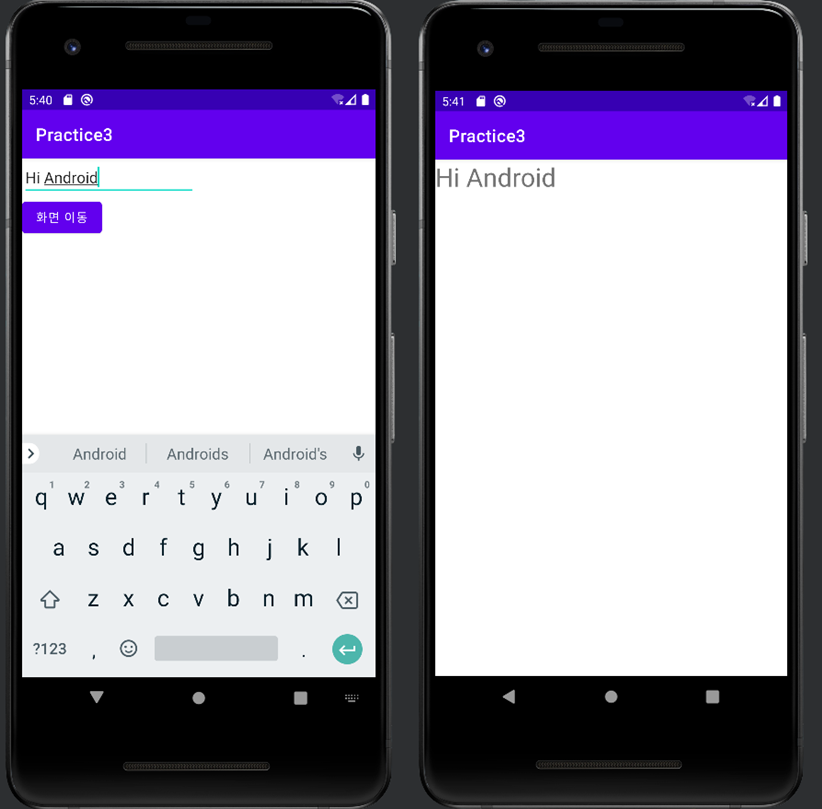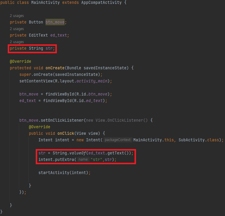 이번에는 메인 액티비티에서 텍스트를 입력받아 서브 액티비티로 이동할 때 서브 액티비티의 문구를 변경해보겠습니다. 먼저 'EditText'를 이용하여 문구를 입력받을 수 있도록 화면에 배치한 후 java 파일에 선언해줍니다. 이후 문자열형 변수에 ed_text.getText()를 하여 문구를 가져와 문자열형으로 변환후 저장합니다. 그리고 이것을 서브액티비티로 보냅니다. putExtra를 이용해 putExtra("별명,데이터) 형태로 작성하면 보낼 수 있습니다.