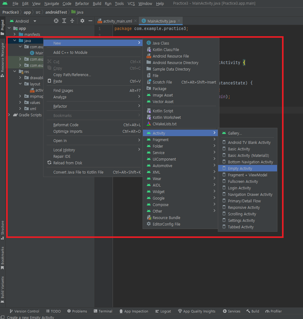 패키지 쪽에서 우클릭 한 후, 아래 사진을 따라 다른 액티비티를 생성해줍니다.