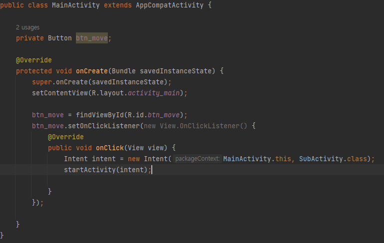 화면에 버튼이 뜬 것을 확인했으면 이제 java파일로 가서 기능을 추가해봅시다. 저번시간에 한 것과 같이 버튼의 id를 이용하여 선언하고 함수를 정의해줍니다. onClick()함수 내부에서 Intent를 사용합니다.Intent()에는 두가지 현재 액티비티, 이동하고 싶은 액티비티 순서로 인자를 넣어야합니다. startActivity(intent)를 통해 액티비티가 이동하게 됩니다.
