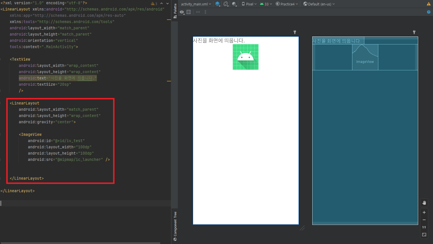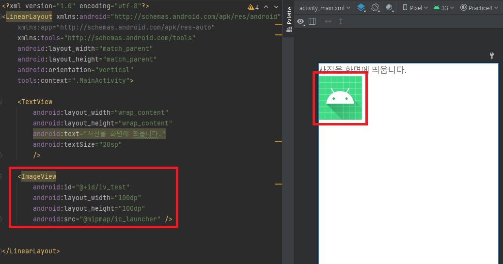 프로젝트 파일 중 xml 파일에 들어가서 'ImageView'를 생성해줍니다.