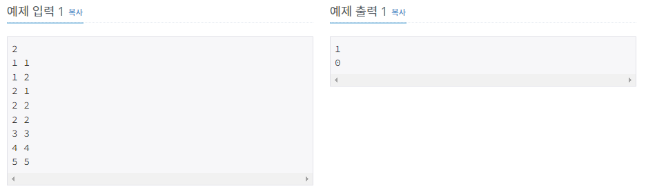 각 테스트 케이스마다 입력으로 주어진 네 점을 이용해서 정사각형을 만들 수 있으면 1을, 없으면 0을 출력한다.