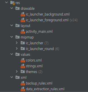 res폴더는 리소스들이 모여있는 폴더입니다. 'drawable'는 이미지 폴더를 담당합니다. 주로 이미지를 모아두는 폴더라고 생각하면 됩니다. 그리고 'layout'는 레이아웃 파일들을 모아놓은 폴더입니다. 주로 액티비티와 연결하는 레이아웃 파일들을 여기서 관리할 수 있습니다. mipmap은 주로 앱의 아이콘 위주로 모여있다고 생각하면 됩니다. 안드로이드의 해상도 단위가 다양하게 나와있습니다. 휴대폰에 각각 dpi를 확인하여 해상도별로 확인할 수 있도록 해줍니다. dpi에 맞춰서 이미지를 분류해줘야 해상도 대응이 완벽하게 일어나 텍스트 이미지 등이 레이아웃에서 벗어나지 않고 유지할 수 있습니다. 'values' 폴더에서는 colors, strings 등이 있습니다. colors파일은 자신이 원하는 컬러를 선언해놓을 수 있습니다. strings파일에서는 길어지는 문장이나 공통적으로 쓰이는 것은 여기에 적으면 편하게 쓸 수 있습니다.