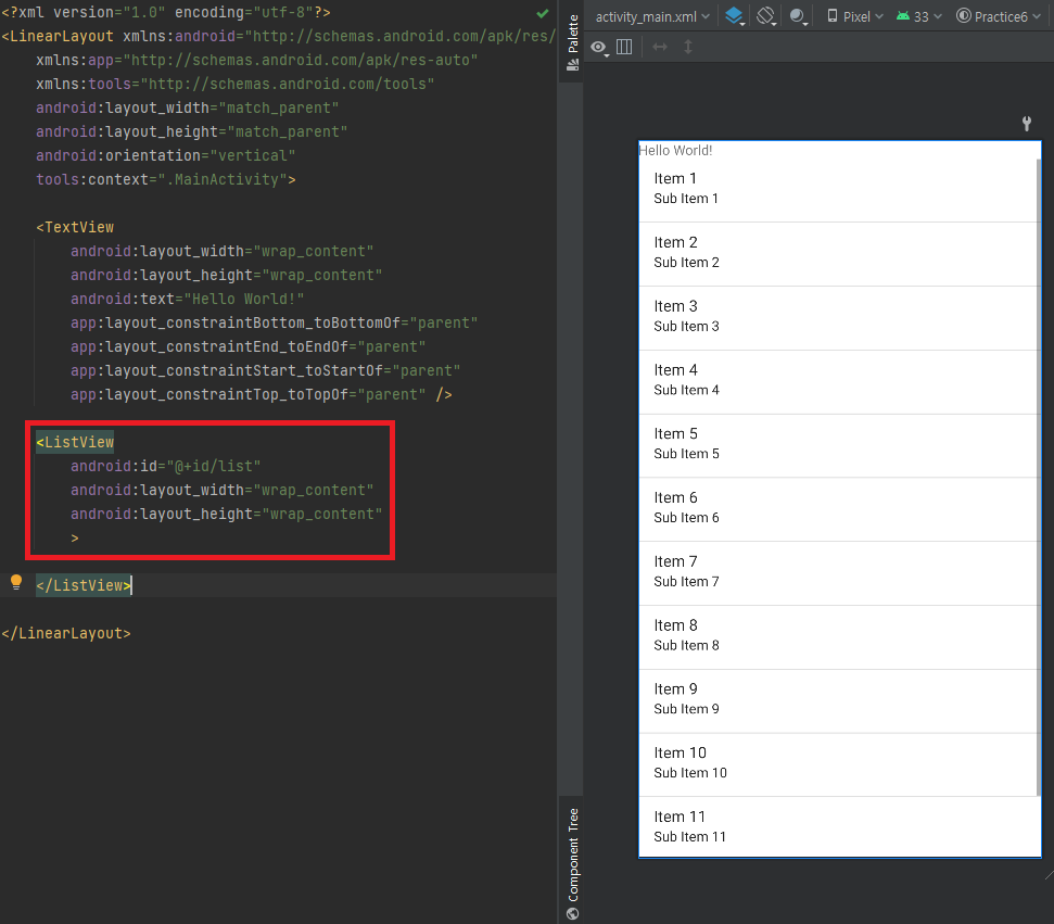 TextView아래에 ListView를 추가하고 id값을 부여해줍니다. 그리고 바로 'MainActivity.java'파일로 가줍니다.