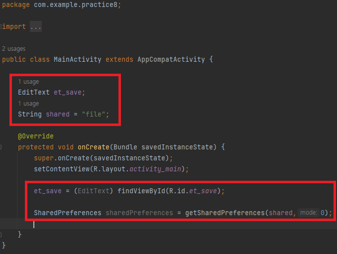 그다음 MainActivity.java로 가서 변수를 선언하고 onCreate안에 코드를 작성하여 xml 파일의 id를 java파일 변수에 연결해주고 SharedPreferences를 씁니다.