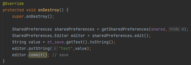 onDestroy()에 다음과 같이 작성합니다. 저장을 할 때 SharedPreferences.Editor를 불러와야하기 때문에 editor에 선언해줍니다. String변수 value에는 EditText에 입력된 값을 받아와줍니다. editor에 받아온 값을 그대로 적어주는데 putString()에 두 개의 인자가 들어가야하는데, 하나는 원하는 텍스트를 적어줍니다. 약간 불러올때 사용하는 별명같은건데 저는 간단하게 text로 적었습니다. 그리고 두번째 인자로는 value를 적어줍니다. editor.commit()을 이용하여 save를 완료해줍니다.