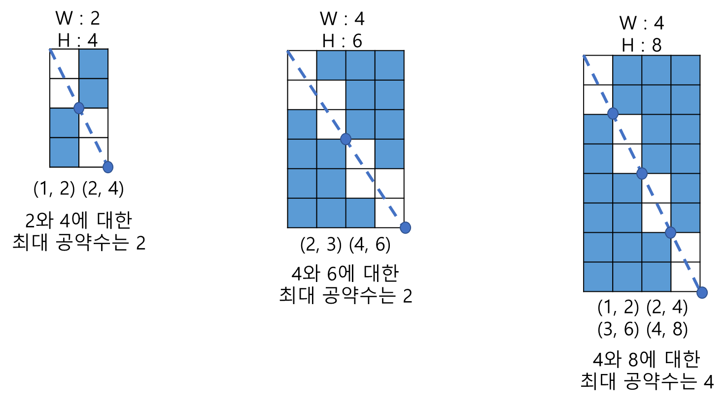 - W : 4, H : 8의 최소 사각형 (1, 2)의 사각형에서는 2개가 제외됩니다.