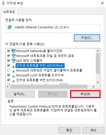 이러한 화면이 뜨게 되는데 '인터넷 프로토콜 버전 4(TCP/IPv4)'를 클릭하고 '속성'에 들어갑니다.