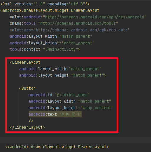 기존의 <TextView>를 지우고, <LinearLayout>를 작성한 후 내부에 <Button>을 작성하고 id를 써줍니다.