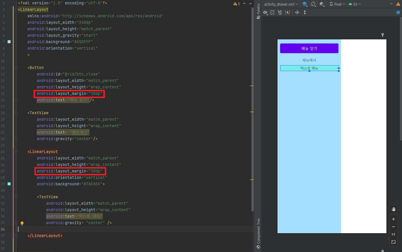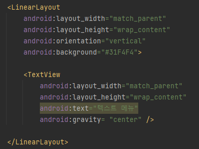 이제 안에 들어갈 것들을 만들어봅시다. LinearLayout은 orientation 방향을 주는게 좋기 때문에 "vertical"로 설정하고, 내부에는 일단 Button과 TextView를 넣어줍니다. Button에는 메뉴를 종료할 수 있는 버튼도 작성해줍니다. 이렇게 버튼으로 영역을 만들어도 되지만 LinearLayout을 통해서도 영역을 만들어줄 수 있습니다. TextView 아래에 다음과 같이 작성해줍니다.