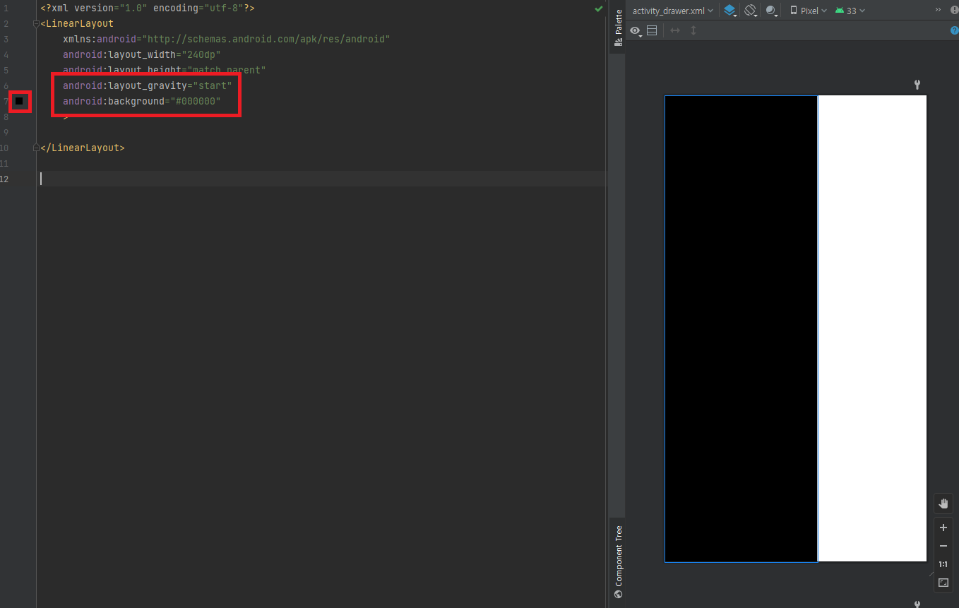 그다음으로는 'layout_gravity" 속성에 "start'를 입력하고 'background'에는 '#000000'을 입력하면 왼쪽 240dp가 검은색으로 변경됩니다. 아마 이 색은 원하지 않을 것입니다. 왼쪽의 사각형을 눌러 원하는 색으로 변경합니다.