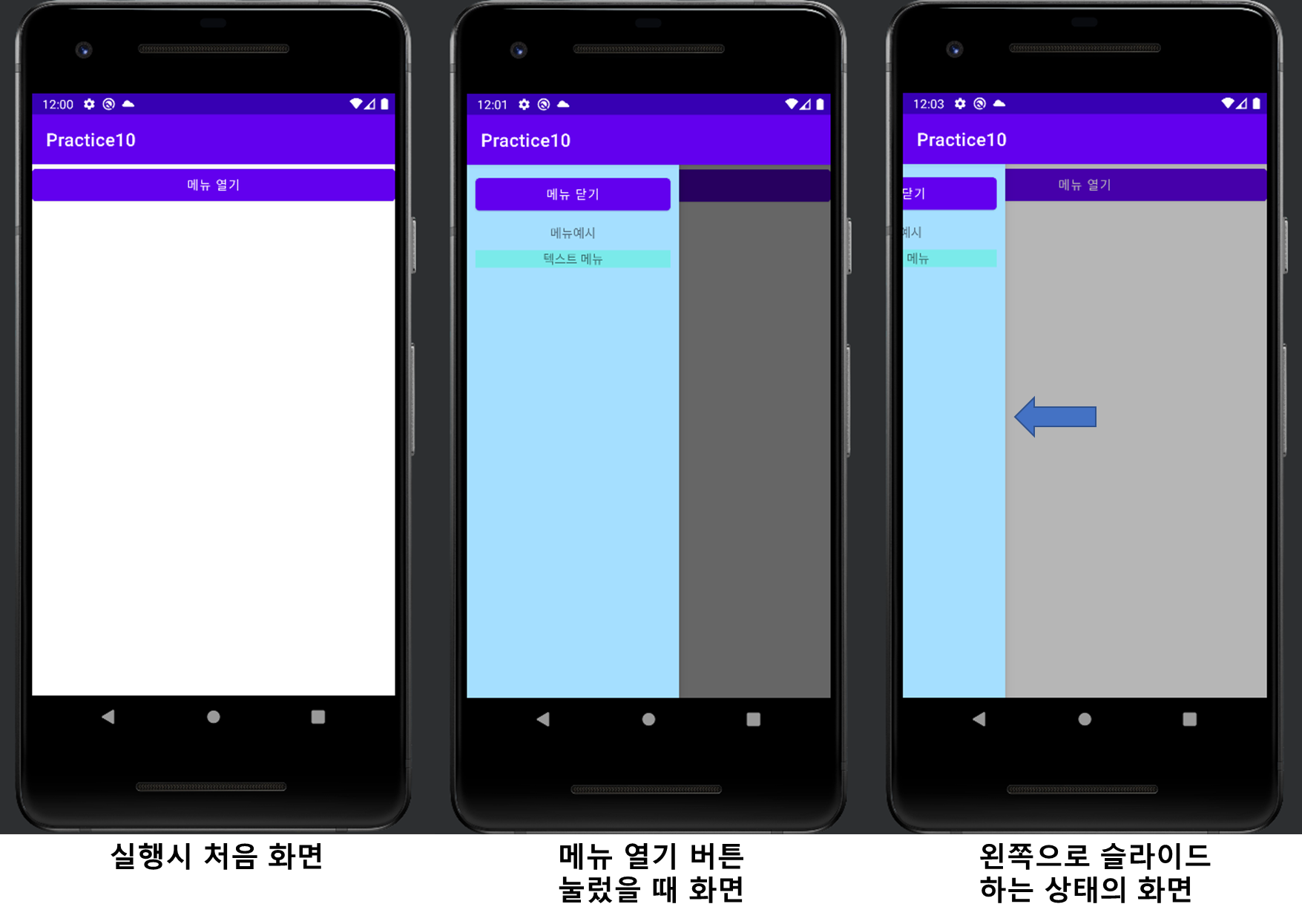 onDrawerClosed : 슬라이드가 닫혔을 때 호출됨.