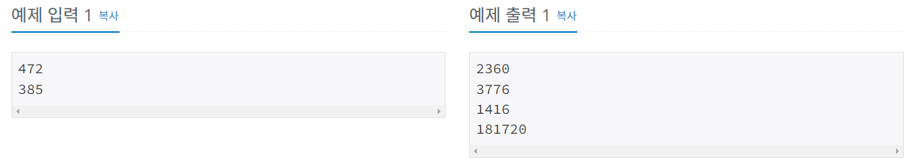 첫째 줄에 (1)의 위치에 들어갈 세 자리 자연수가, 둘째 줄에 (2)의 위치에 들어갈 세자리 자연수가 주어진다.