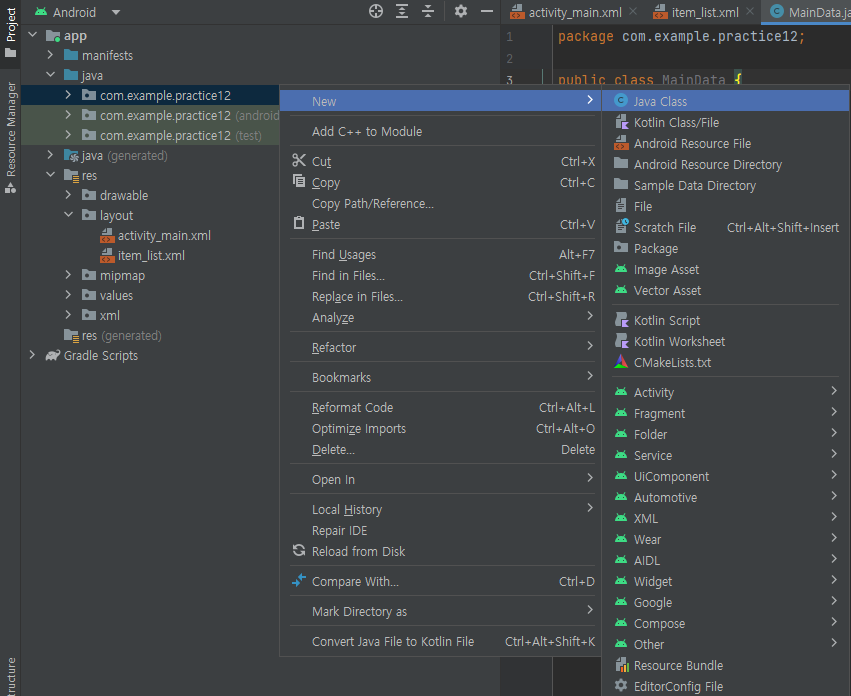 이제 리스트 데이터가 들어갈것을 선언을 다 해줘야합니다. 좌측의 Project 켜고 app - java - 첫번째 폴더 우클릭 - New - Java Class를 눌러 생성합니다. 전 파일 이름은 'MainData'로 생성했습니다.