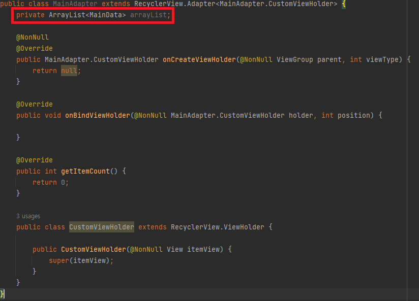 이제 메인 액티비티와 Adapter를 연결해야합니다. 먼저 변수를 선언합니다.
