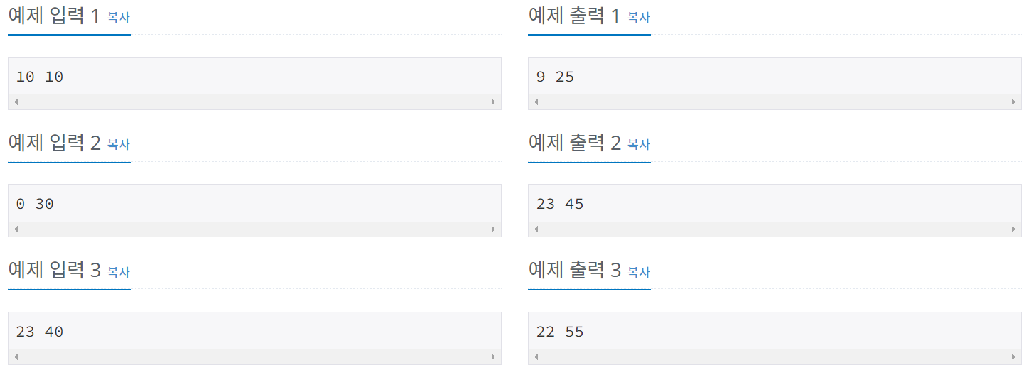 첫째 줄에 상근이가 창영이의 방법을 사용할 때, 설정해야 하는 알람 시간을 출력한다. (입력과 같은 형태로 출력하면 된다.)