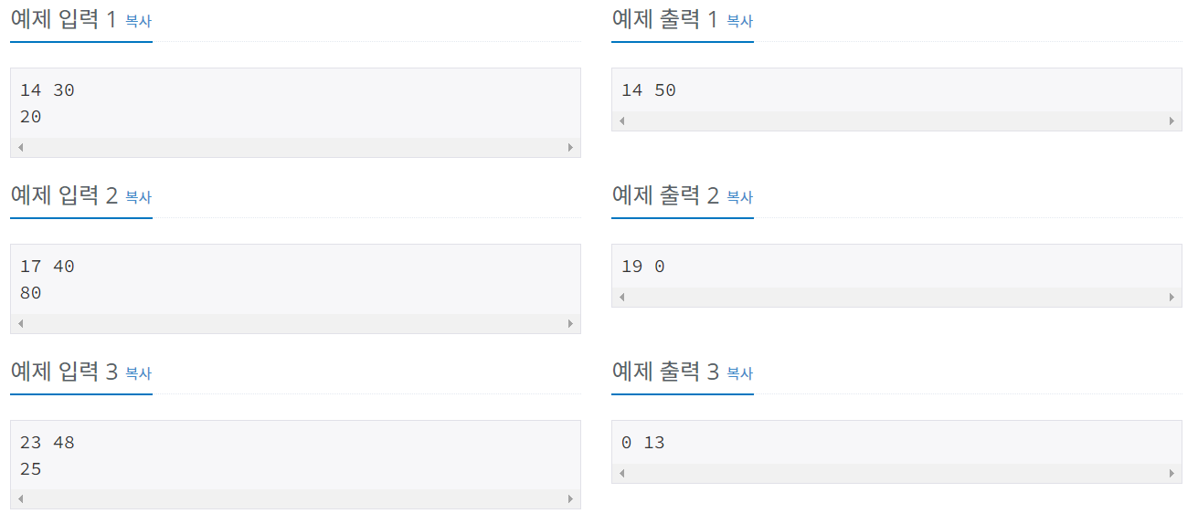 첫째 줄에는 현재 시각이 나온다. 현재 시각은 시 A (0 ≤ A ≤ 23) 와 분 B (0 ≤ B ≤ 59)가 정수로 빈칸을 사이에 두고 순서대로 주어진다. 두 번째 줄에는 요리하는 데 필요한 시간 C (0 ≤ C ≤ 1,000)가 분 단위로 주어진다.