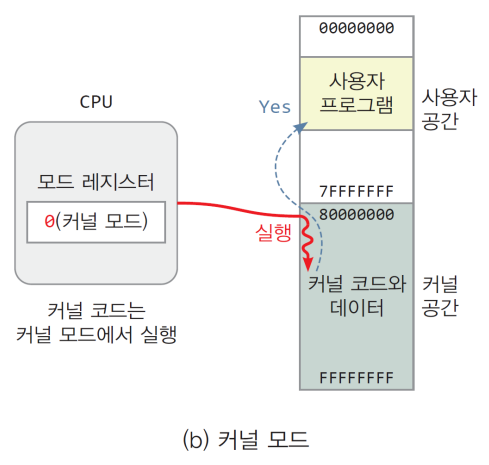 | CPU 실행 모드 | 사용자 모드 | 사용자 모드에서 커널 모드로 전환 |