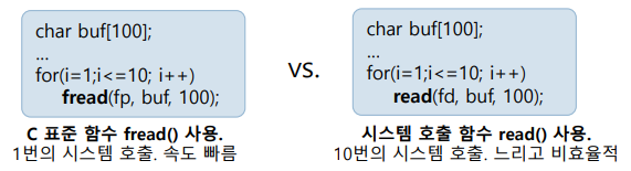 - 시스템 호출은 함수 호출에 비해 많은 시간 비용 (시스템 호출을 많이 할수록 프로그램 실행 속도 저하)