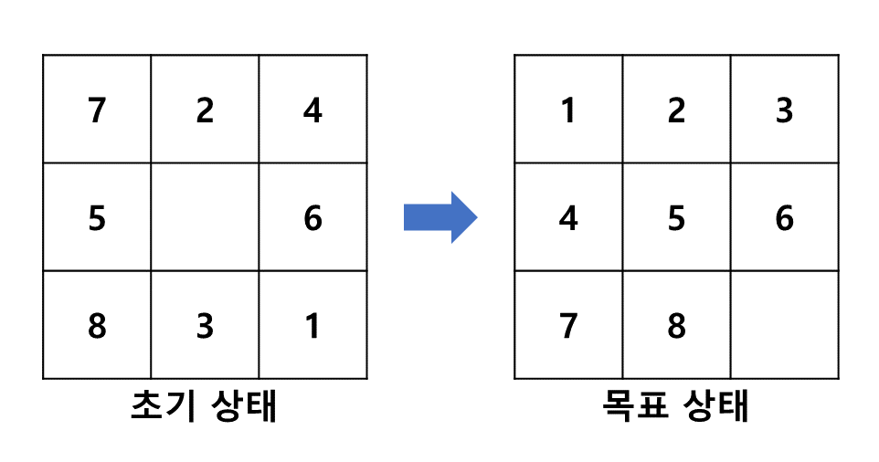 - 상태 (state) : Location of tiles : 8개의 타일의 각각의 위치와 빈칸의 위치