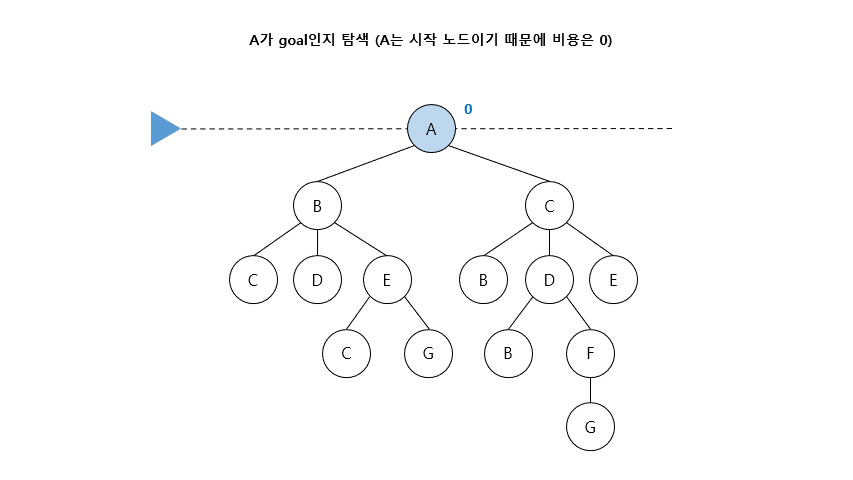 - 시작 노드부터 goal인지 검사한 후, 노드를 확장하고 비용이 작은 fringe 선택함