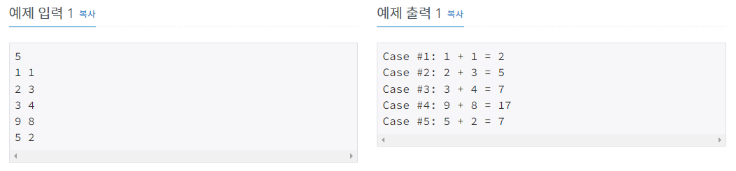 각 테스트 케이스마다 "Case #x: A + B = C" 형식으로 출력한다. x는 테스트 케이스 번호이고 1부터 시작하며, C는 A+B이다.