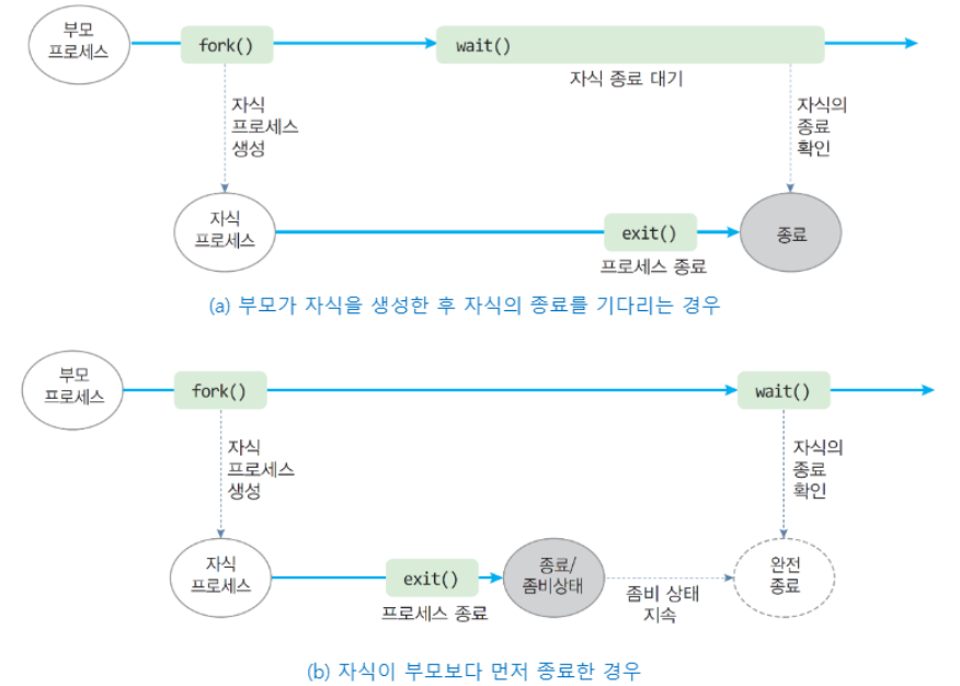 - 부모 프로세스가 wait() 시스템 호출을 통해 죽은 자식이 남긴 종료 코드를 읽게 되면 자식 프로세스의 PCB가 제거