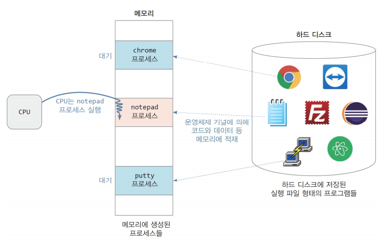 - 운영체제는 프로그램을 메모리에 적재하고 프로세스로 다룸