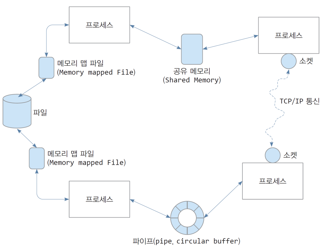 - 신호, 소켓, 메시지 큐, 세마포, 공유 메모리, 메모리 맵 파일 등