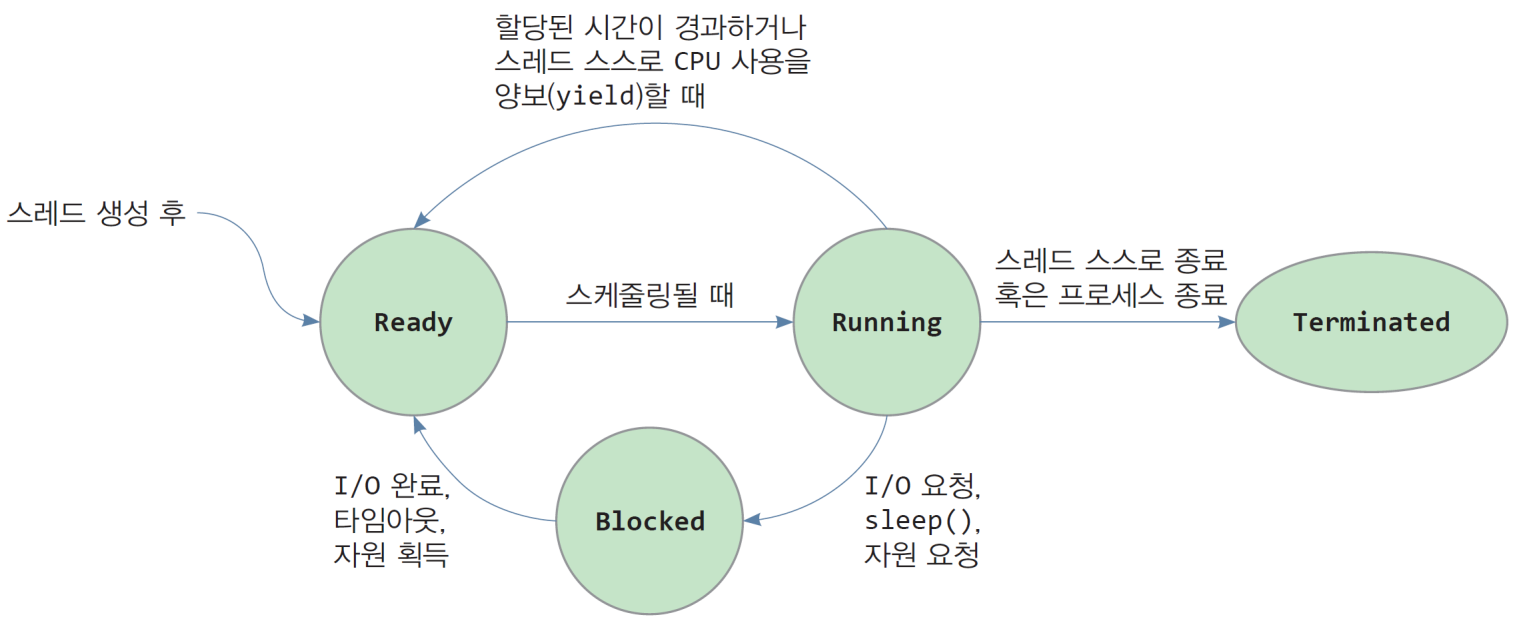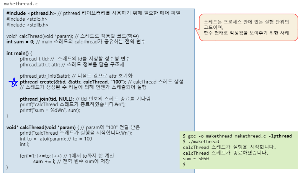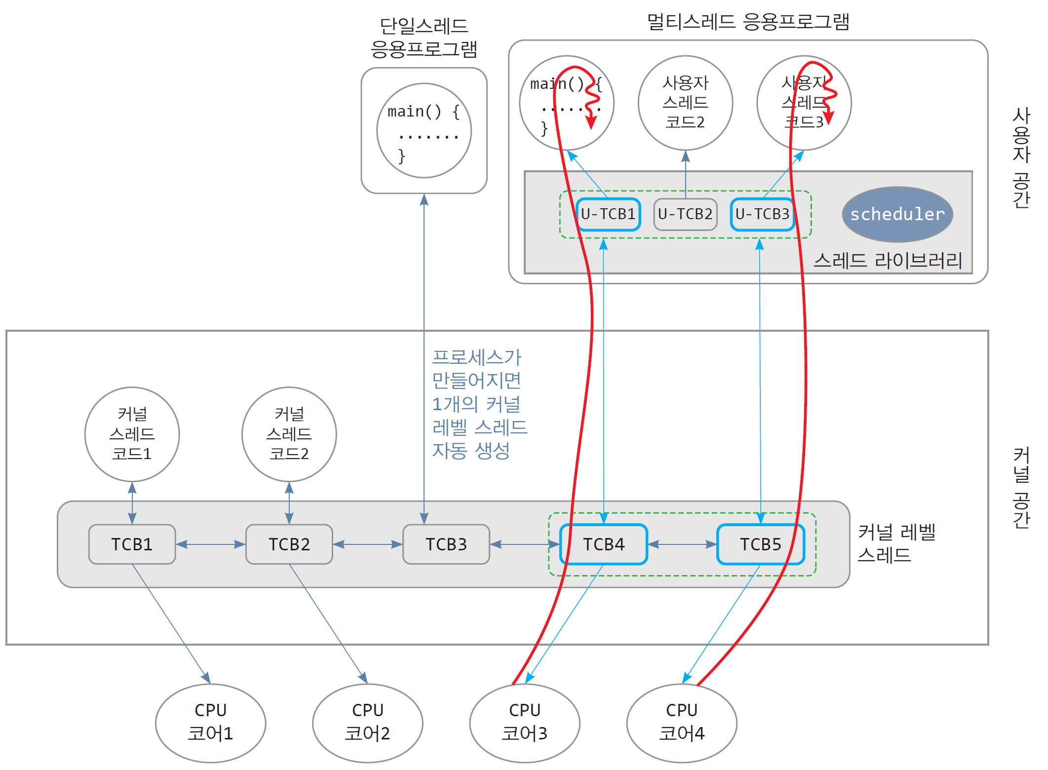 - 운영체제는 TCB 생성, 함수의 주소를 스레드 실행 시작 주소로 TCB에 등록
