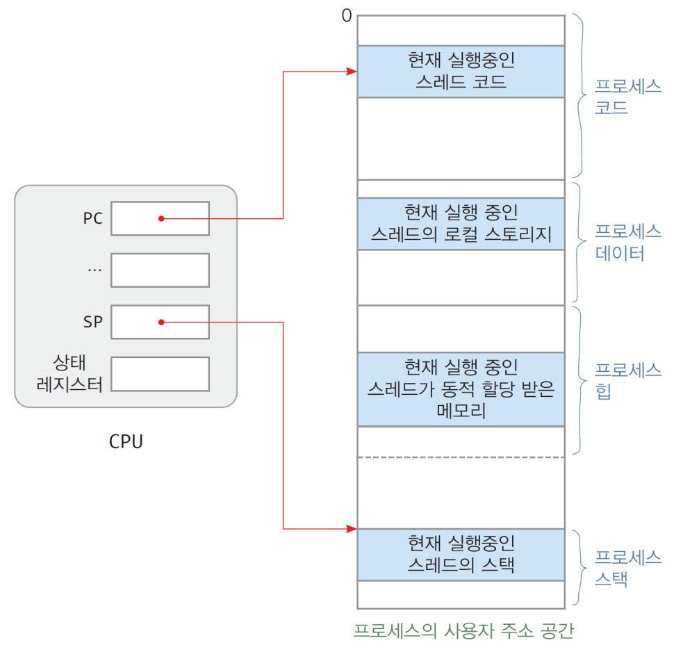 - 모든 스레드는 프로세스의 코드, 데이터, 힙을 공유하며, 프로세스의 스택 공간을 나누어 사용