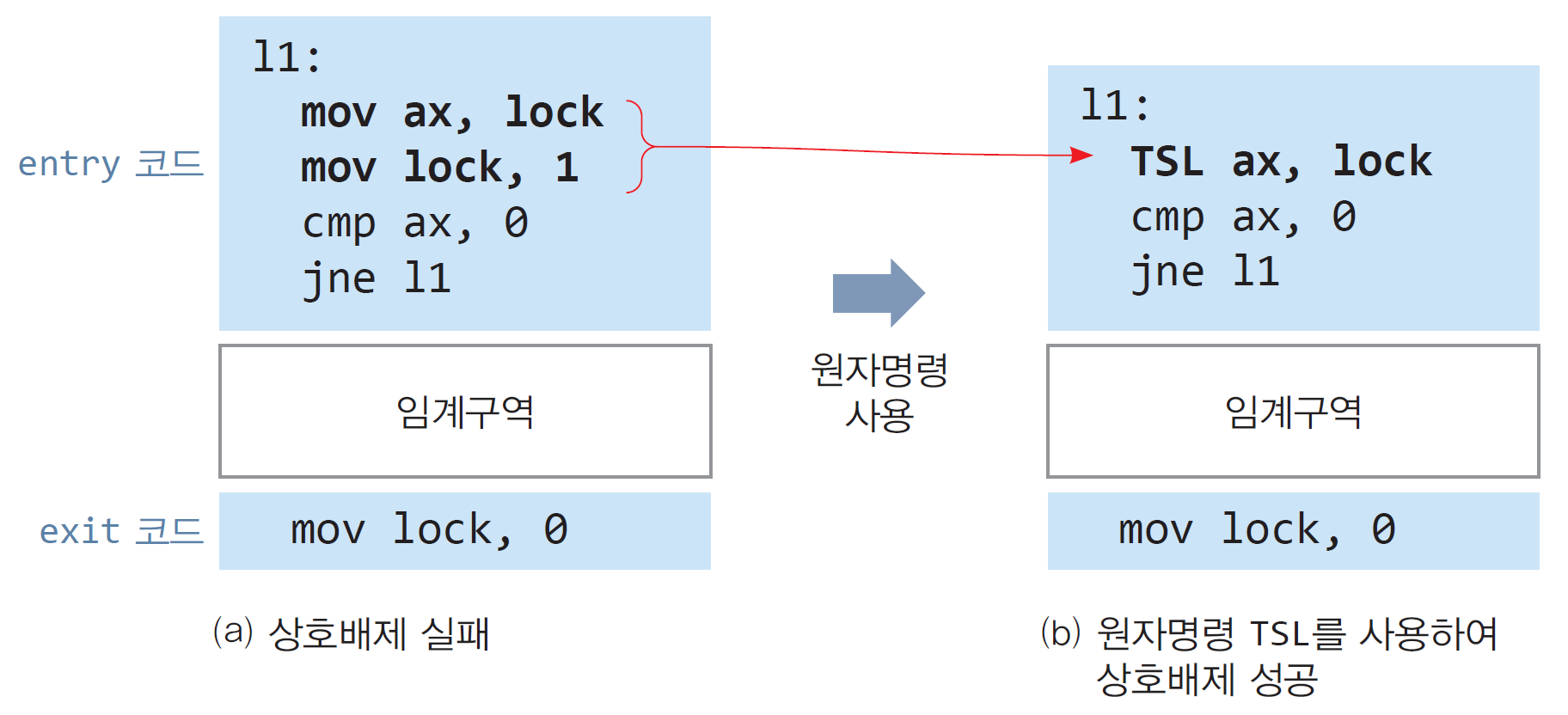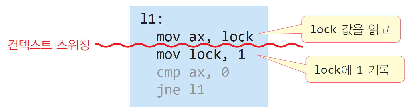 - 인터럽트 서비스 금지, 원자 명령 활용 등
