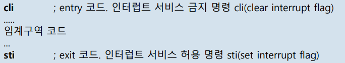 - 인터럽트 서비스를 금지하거나 허용하는 CPU 명령 사용