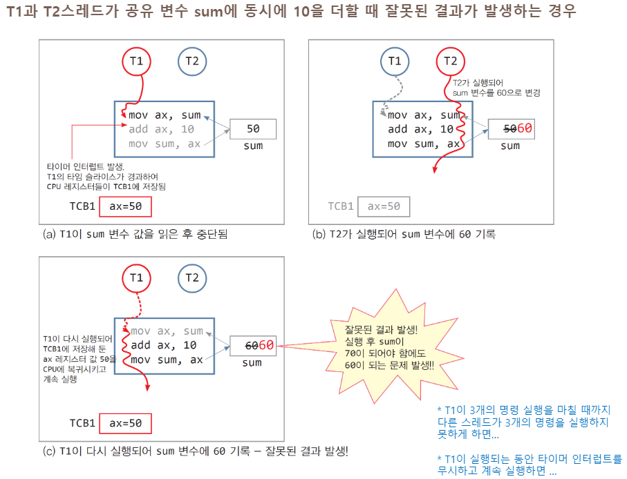 - 여러 스레드가 공유 변수에 접근할 때, 공유 데이터 훼손