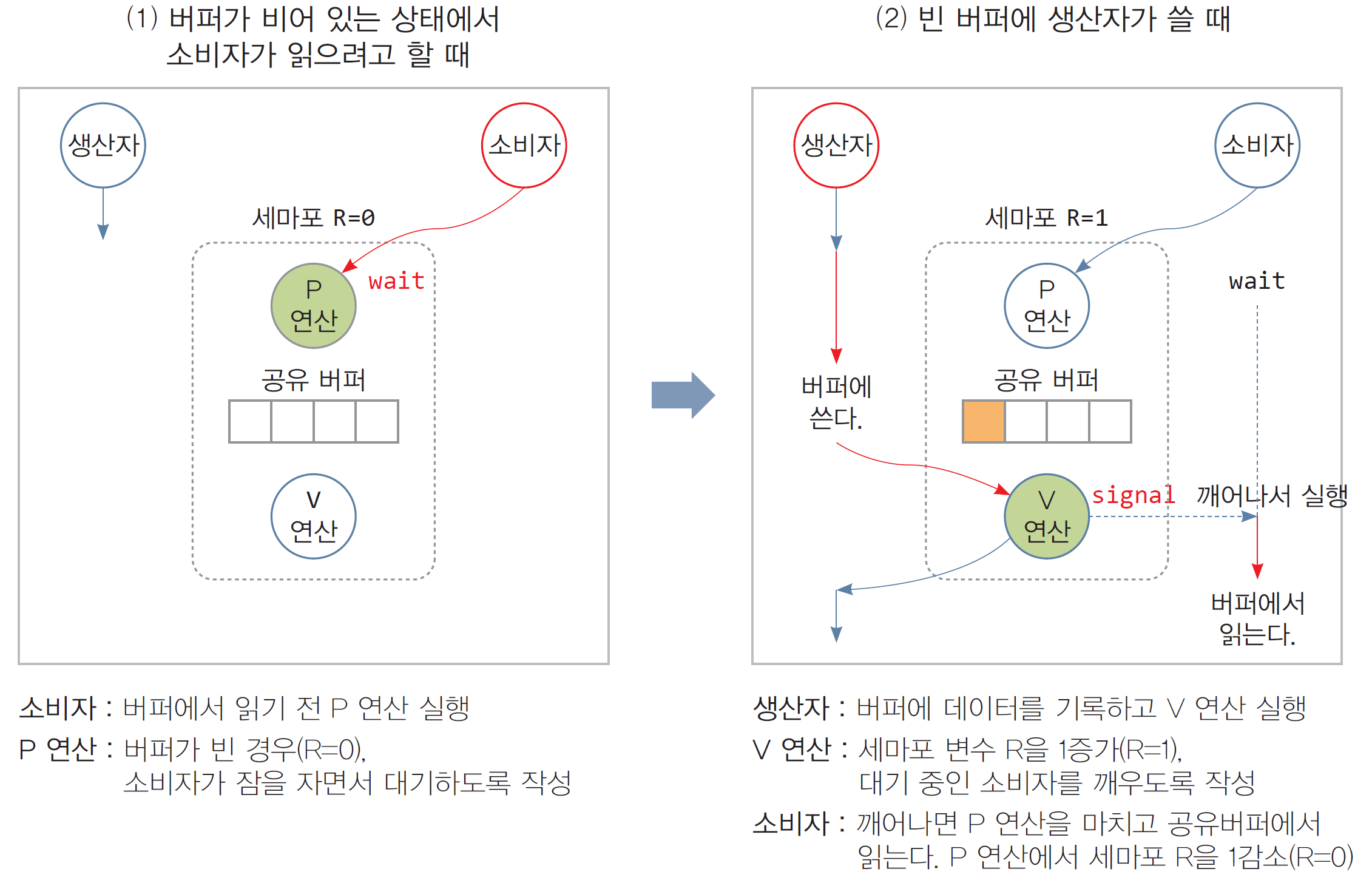 - 세마포어 R 활용(읽기 가능한 버퍼 개수) : 버퍼가 비어있는지 살피는 P/V 연산으로 해결