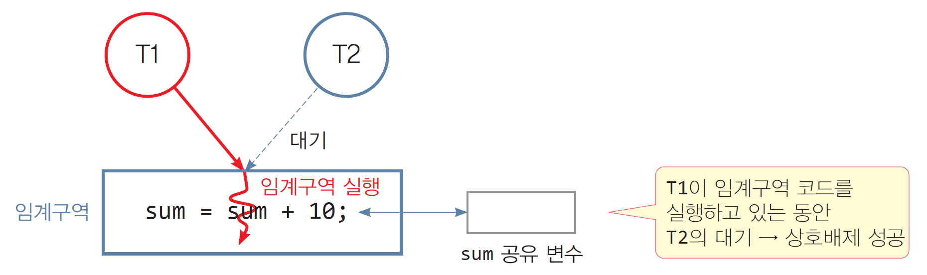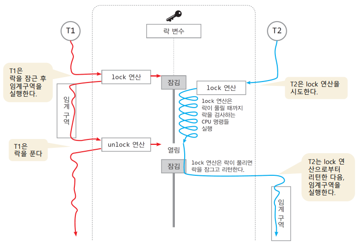 - 임계구역에 먼저 진입한 스레드가 임계구역의 실행을 끝낼 때까지 다른 스레드가 진입하지 못하도록 보장