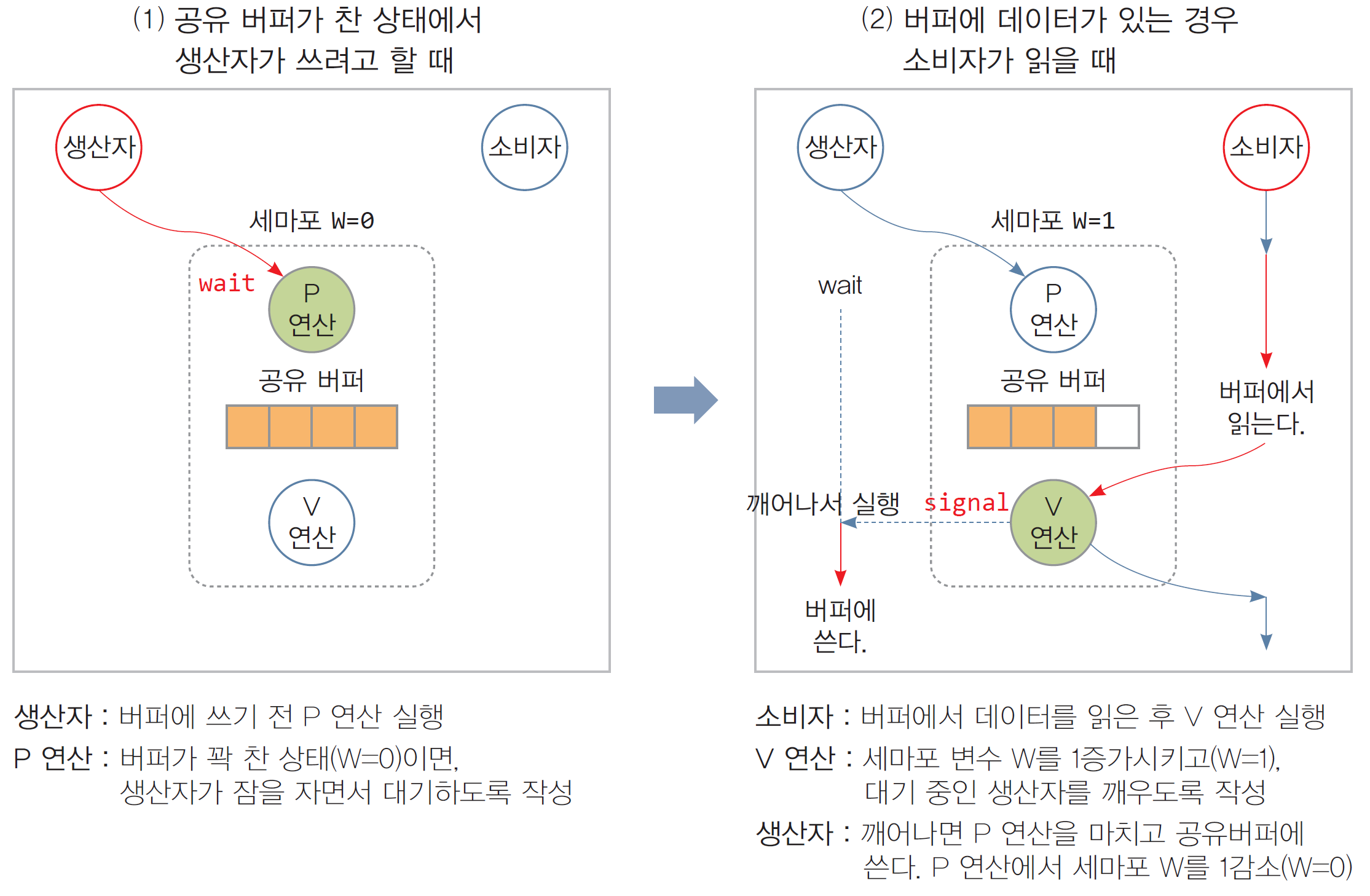 - 세마포어 W(쓰기 가능한 버퍼 개수) 활용 : 버퍼가 꽉 차 있을 때 처리하는 P/V 연산으로 해결