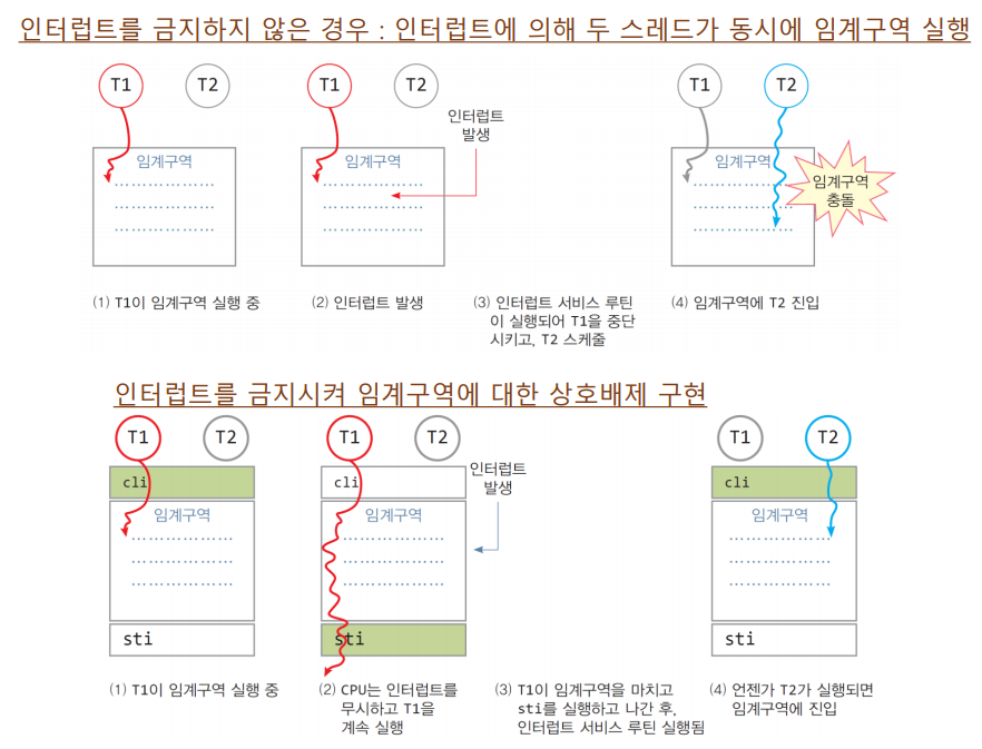 - 인터럽트를 무시하면 임계구역을 실행하는 스레드가 중단되지 않음