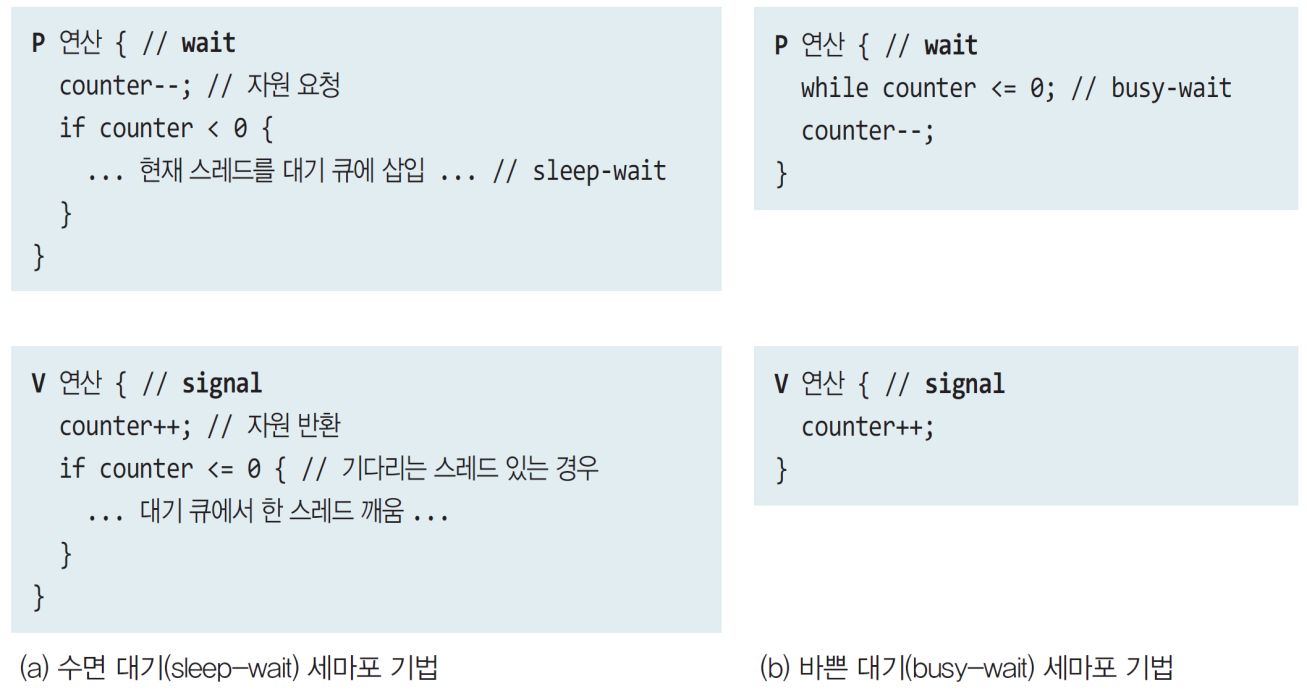 - 세마포어 종류 2가지 - sleep-wait 세마포어와 busy-wait 세마포어