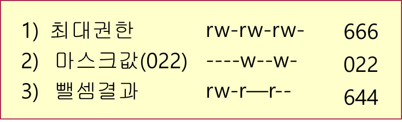 - 유닉스에서 새로운 파일이나 디렉토리를 만들때 부여되는 접근 권한
