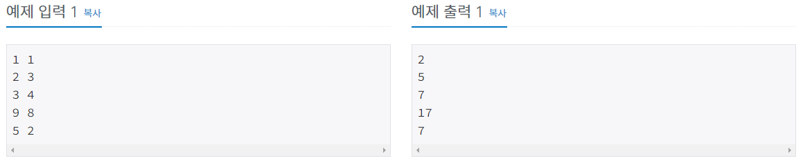 각 테스트 케이스는 한 줄로 이루어져 있으며, 각 줄에 A와 B가 주어진다. (0 < A, B < 10)